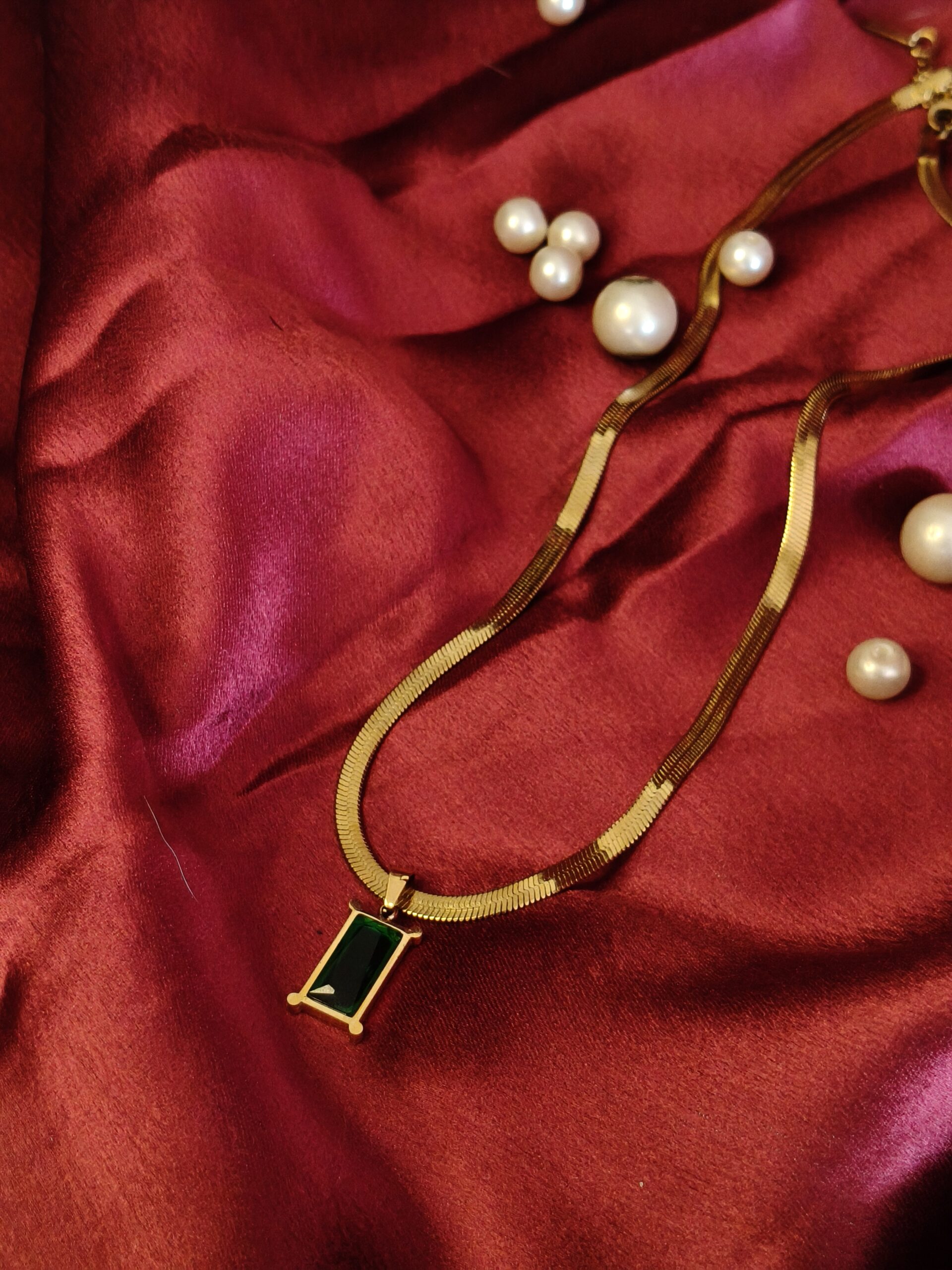 A timeless gold-toned chain adorned with a deep green rectangular stone pendant, crafted to add effortless elegance to any look.…